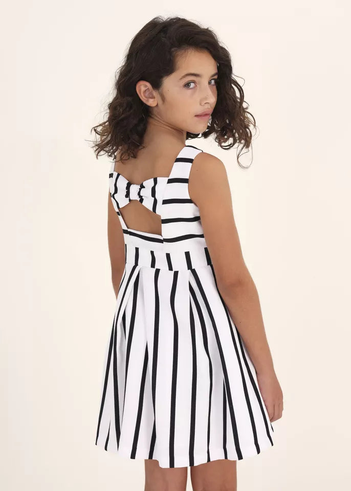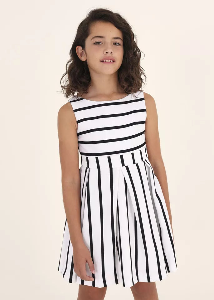 Представляємо класичне плаття в смужку для дівчинки від Mayoral, яке поєднує в собі елегантність і комфорт. Це плаття - ідеальний вибір для будь-яких особливих подій чи щоденних прогулянок. Завдяки чорним і білим смужкам, воно підкреслює витончений стиль і додає індивідуальності кожній юній модниці.