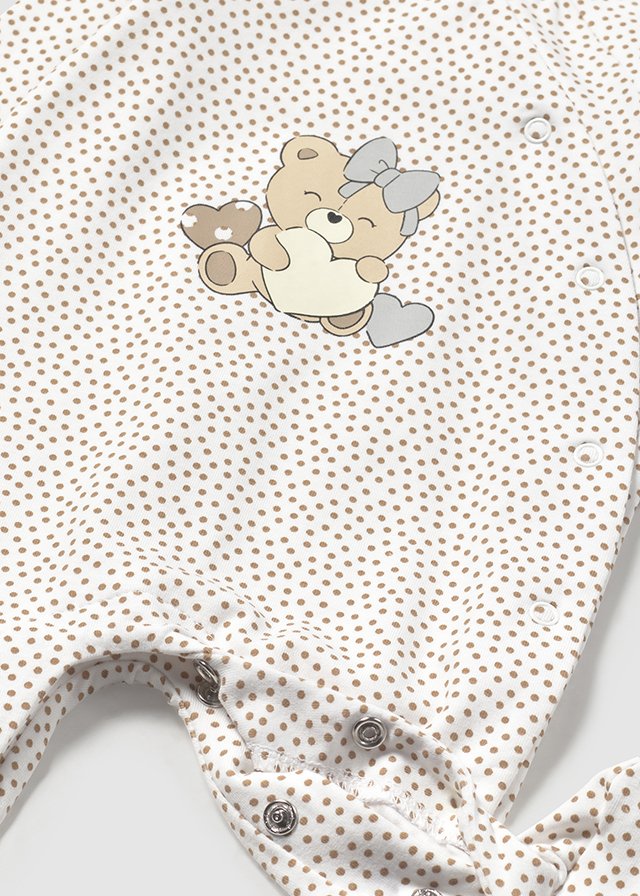 🧸 Ніжний чоловічок для дівчинки – комфорт і стиль для вашого малюка! Виріб виконаний у світлих тонах з милим принтом ведмедика на грудях і дрібним горошком по всій тканині. Такий дизайн виглядає ніжно та затишно, роблячи цей комбінезон ідеальним вибором для дому, прогулянок або сну.