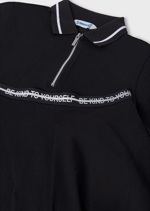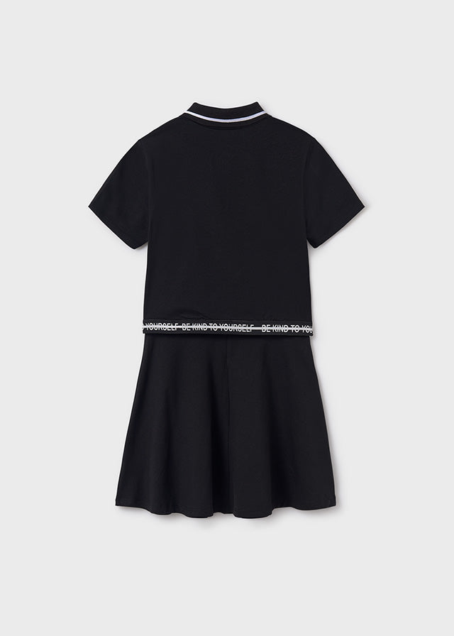 Стильний чорний костюм для дівчинки від іспанського бренду Mayoral – ідеальний вибір для активних і стильних дівчат. До комплекту входять футболка-поло з коротким рукавом і спідниця-кльош, що забезпечує комфорт та свободу рухів.