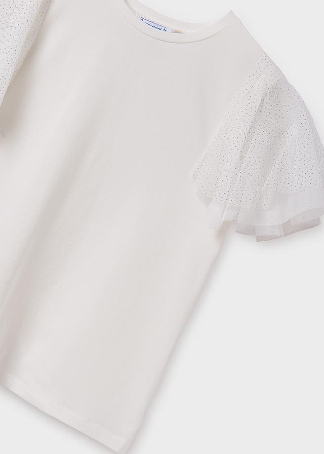 Родзинка цієї моделі – ефектні пишні рукави з фатину, декоровані дрібним мерехтливим напиленням. Вони додають ніжності та святкового шарму, роблячи футболку чудовим вибором не тільки для щоденного носіння, а й для особливих подій.