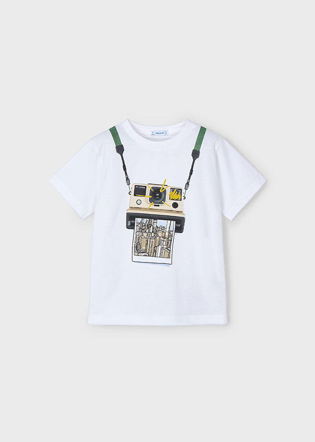 Біла футболка для хлопчика від іспанського бренду Mayoral – стильний вибір для маленьких дослідників світу. Оригінальний 3D-принт із фотоапаратом і ремінцями створює ефект аксесуара, що додає образу унікальності.