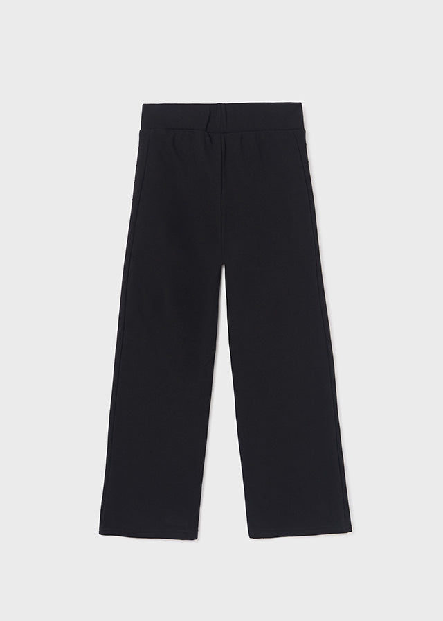 Стильні спортивні брюки палацо для дівчинки, представлені в елегантному чорному кольорі, ідеально підходять для активного відпочинку та повсякденного носіння. Виготовлені з високоякісних матеріалів, що складаються з 58% бавовни та 42% поліестеру, вони забезпечують максимальний комфорт та свободу рухів.