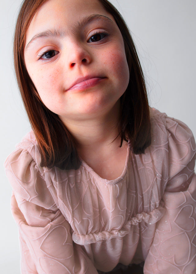 Ніжна сукня Mayoral для дівчинки — пудровий тюль із візерунком і блиском