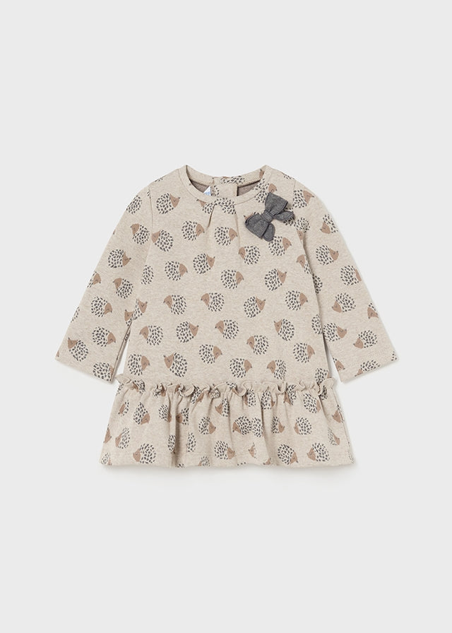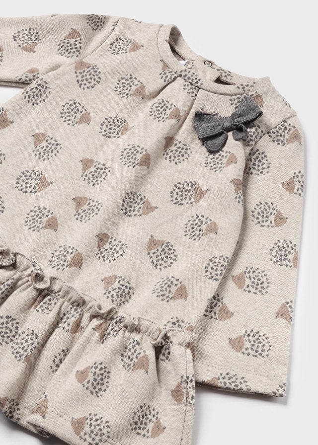 - Дизайн: Сукня виконана у бежевому кольорі з милим принтом їжачків, що додає їй грайливості та чарівності. Елегантний бантик на плечі додає особливого шарму.