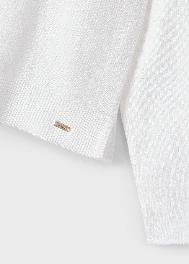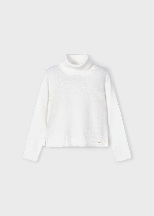 Білий гольф для дівчинки від іспанського бренду Mayoral — ідеальна база для холодного сезону. Завдяки високому коміру та м’якому трикотажу він не тільки зігріває, а й виглядає стильно. Підійде як для школи, так і для щоденного носіння.